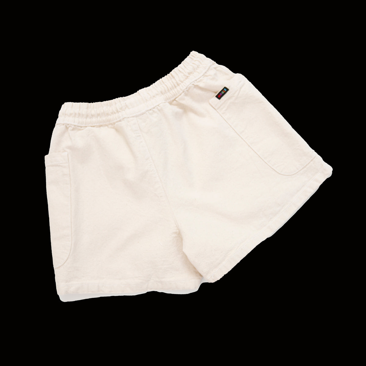 大きなパッチポケットが2つ付いたクッキンショーツ。小麦粉、これ。未染色。ソフトウォッシュ済み。広めの脚開き。通気性は抜群です。