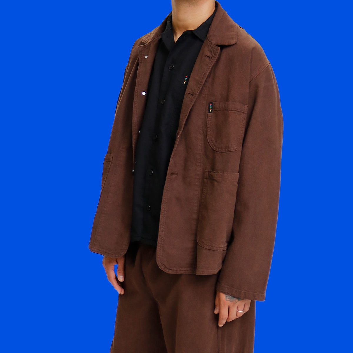 Hearty canvas jacket. Full cut. Big pockets for sandwiches. Looks like a shot of espresso with a little milk in it. Don't wear it before bedtime or you'll be up all night. Sleeves are made long for cuffing or altering to customize your length.