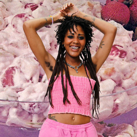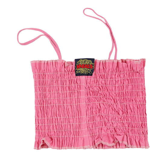 Smocked cotton top. Canvas gathered with elastic threads. Looks like lettuce, what with all the surface area. Color here is Flour. Doubles in size. Comfy. Meals label at center back.