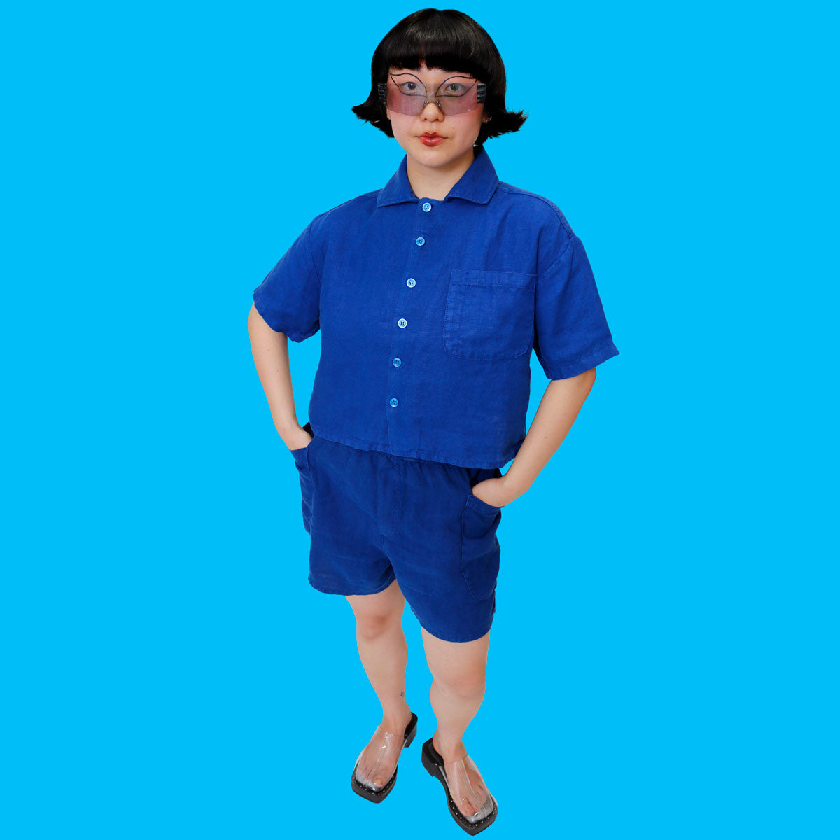 Boxy, accommodating. Cut from a sturdy/breathable 7.5 oz linen. Sleeves hit at the elbow and are meant to be rolled or left long and then it’s another vibe. ‘Cut-away’ style collar has a great ‘roll’, and the big chest pocket comes with a pen slot (pen not included, you provide the pen).