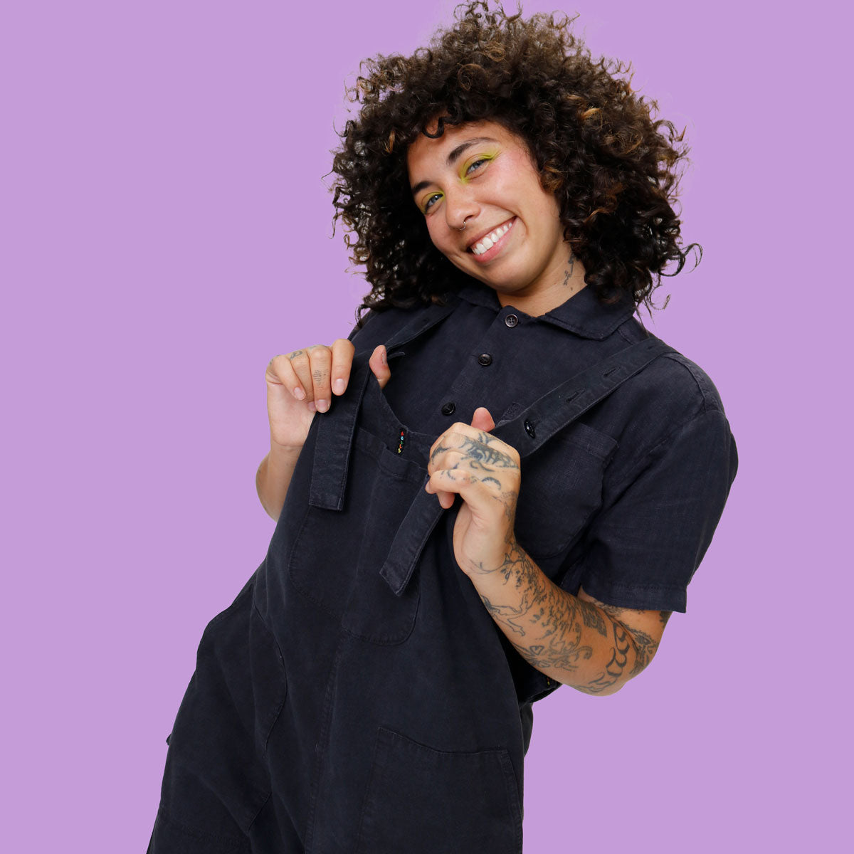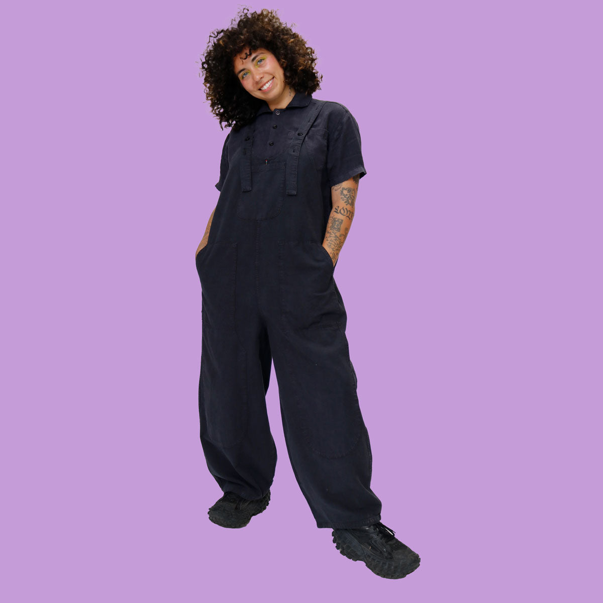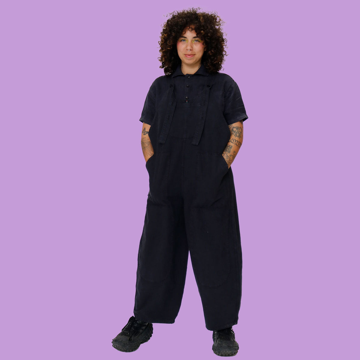 NEW OVERALLS* Cropped double-knee cotton overalls. Follows the chef pant in spirit. Infinite pockets (6!!). If you want a longer leg, order a size up.