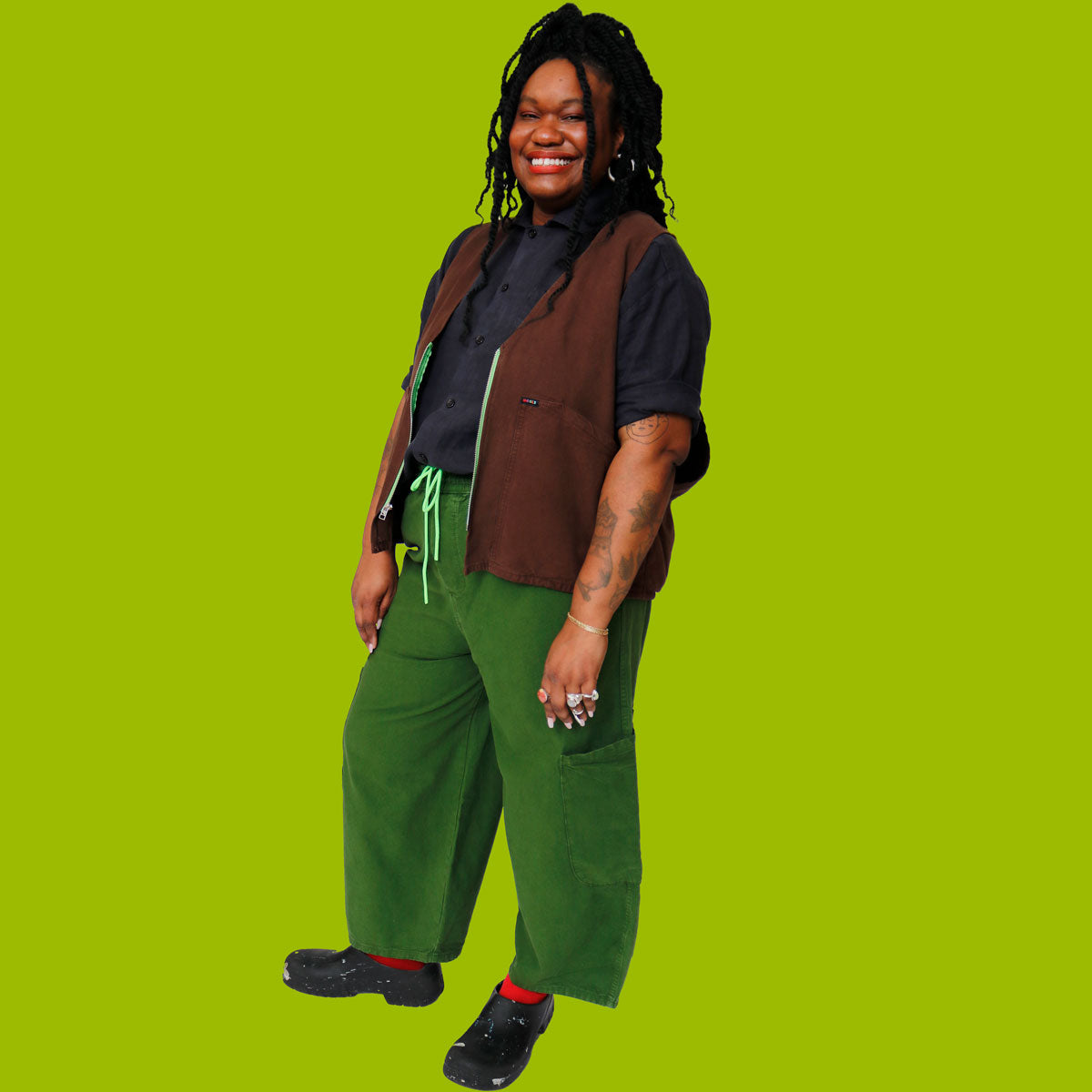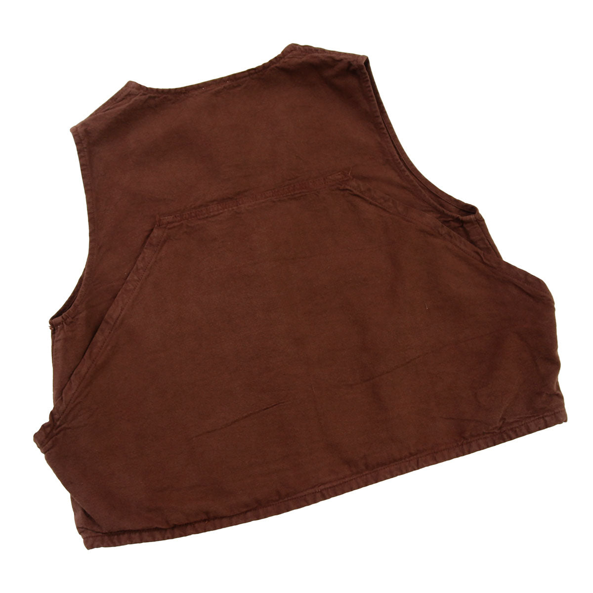 A hunting vest kinda. 10 oz heavy canvas with front patch pockets and a massive carrier pocket on the back (think 16” laptop). Zip closure in front. Oversized. Take your normal size. Adds huge pockets to everything. Leave the bag at home, fella.