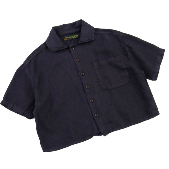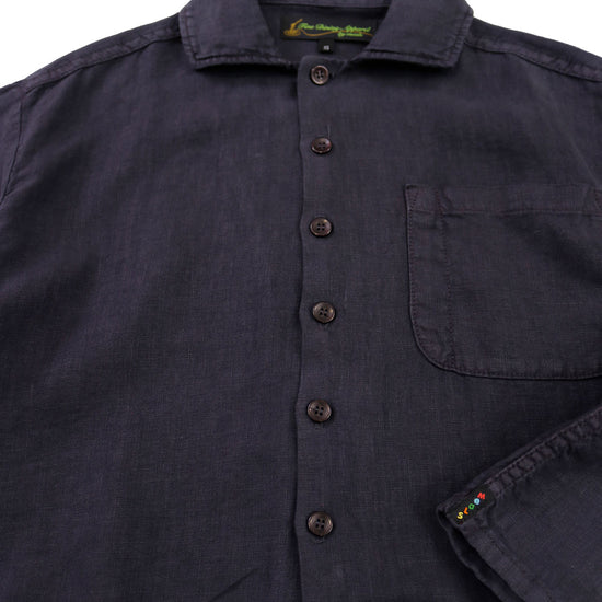 Boxy, accommodating. Cut from a sturdy/breathable 7.5 oz linen. Sleeves hit at the elbow and are meant to be rolled or left long and then it’s another vibe. ‘Cut-away’ style collar has a great ‘roll’, and the big chest pocket comes with a pen slot (pen not included, you provide the pen).