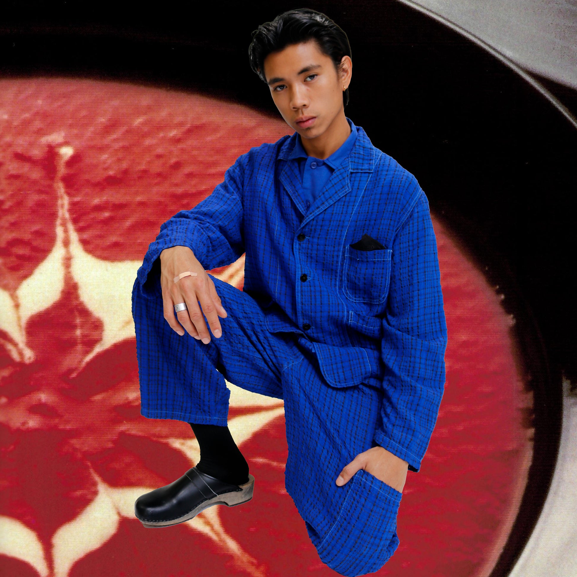 A very textured dinner jacket. Slinky, breathable, unstructured with a soft shoulder. Almost like a checkerboard seersucker.