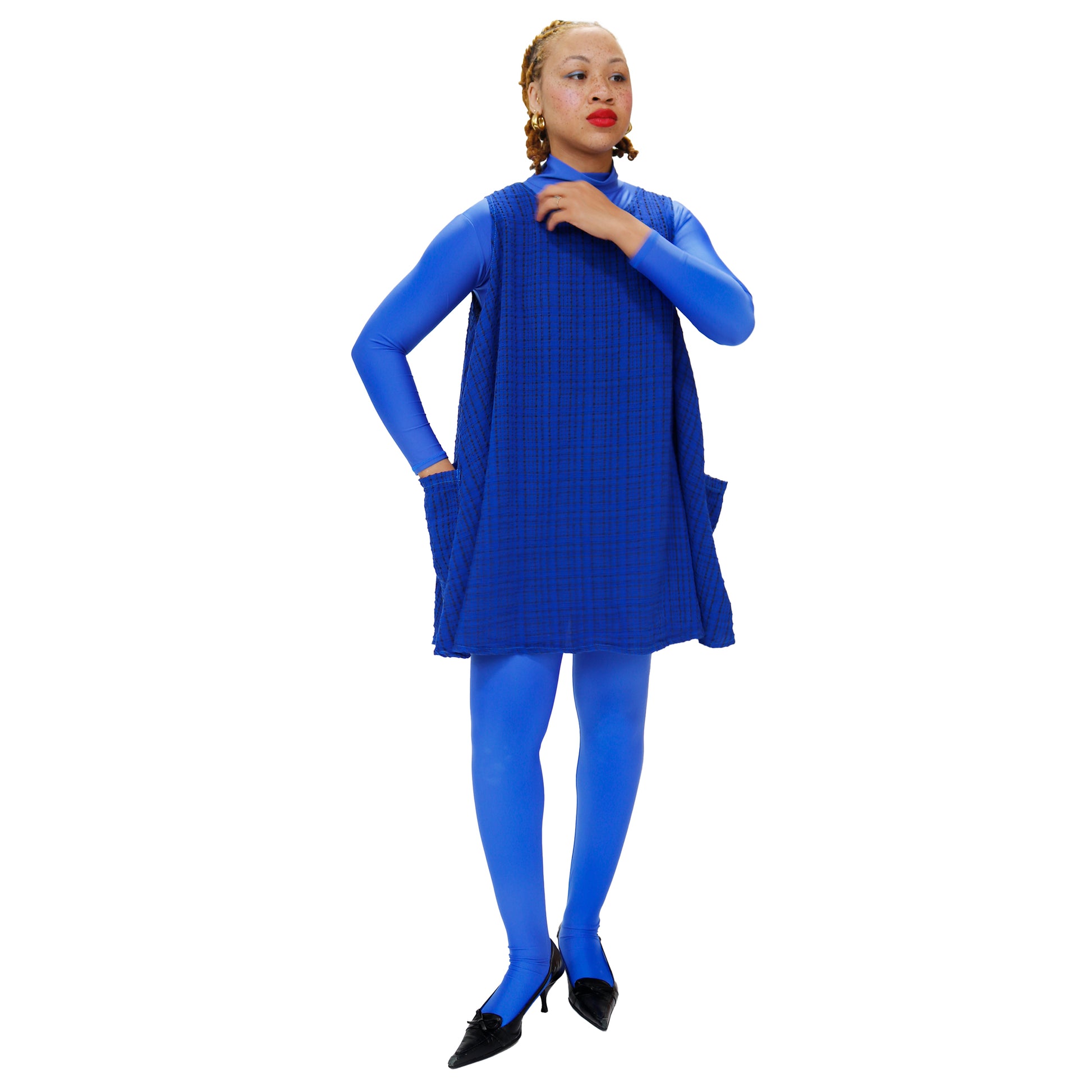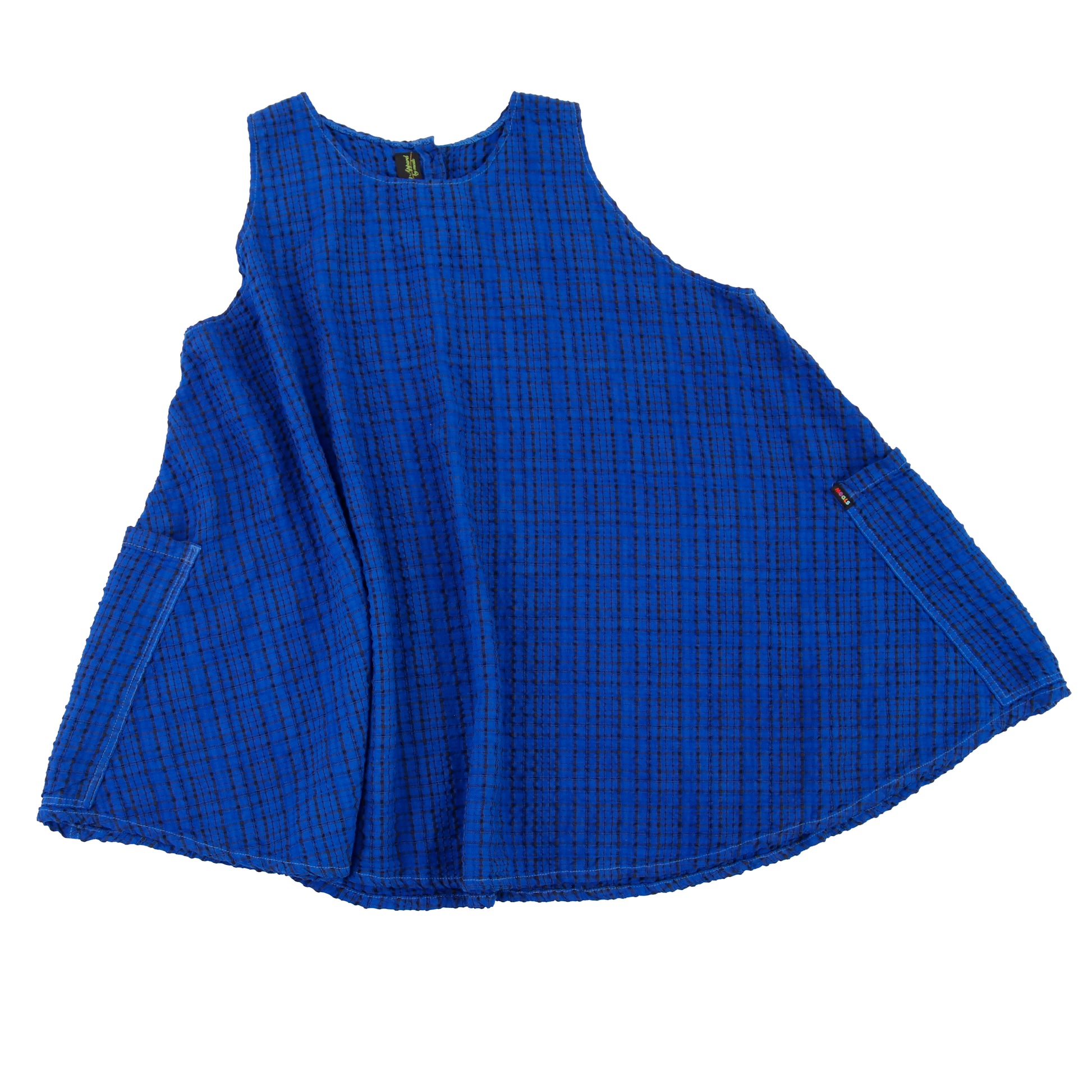 Textured circle dress with big patch pockets at sides. Top mod. Eat up. Button closure at neck. One size (for now).